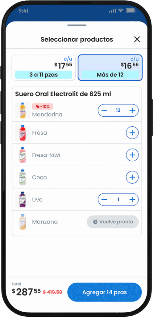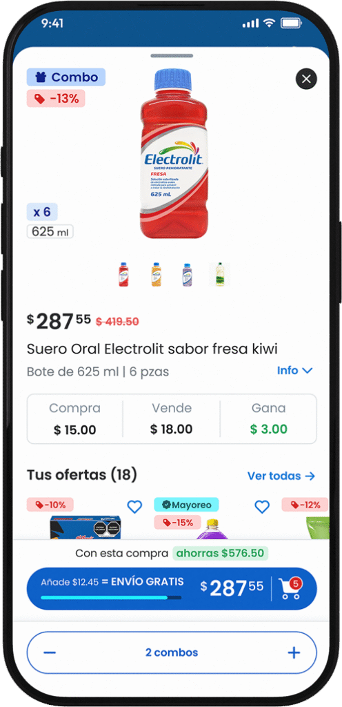 • +50% average order value via simple product cards, presets (1/6/12/case), and combos.